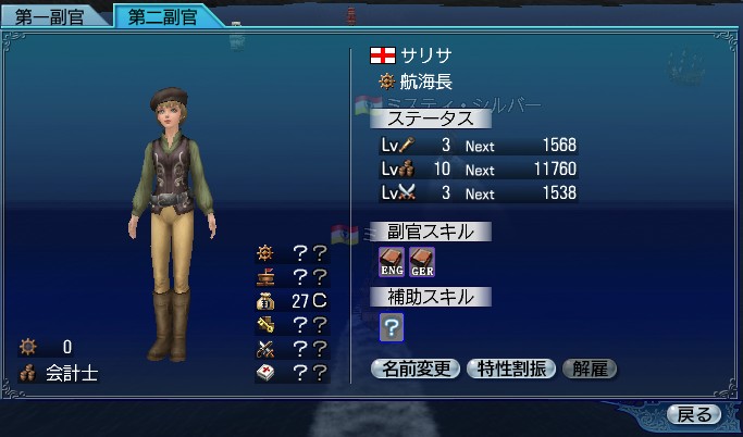 リスボン-コチン(101日間) ■船 商用大型ガレオン(船員64名) ■使用したもの 名医の秘薬×32(10k換算) 盟約の美酒×18(20k換算) ■イベント(?) 反乱×5(うち2回説得成功) 交易品盗み(マスケット×7 ケンカ×4 壊血病×5 ■補足情報 生存船員43名(21名死亡) 最大疲労増加 1日・・・23 最大減少忠誠度 1日・・・14 後半、盗まれたマスケット枠を使って釣りして食料にすると 疲労度と忠誠度に若干の軽減あり。 ■分析 概算経費計上 約700k 赤字分をマスケット売却推定純利益(4k)にて空けられる船倉(-175樽) 水160樽+食料15樽(釣り)での推定航海可能日数90日(運用R9) どうみても大赤字です本当にありがとうございました。orz P.S 副官の説得スキルと統率ランクをMAXにして反乱への万全の体制で、 忠誠度0状態で航海を成し遂げることで黒字になるはずっ いや、一流の商人を目指すのであればそうして意地でも黒字にすべきだ! ふむ、まちがいないっ PR |