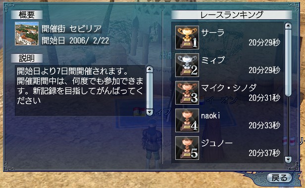途中で突風のアクシデント(もしくは幸運か?)に見舞われながらも1位タイ記録による堂々の2位ですよー。 ホントはここまでがんばるのに4往復してたりします… そして、景品はというと…「魔術の刻印3つ」orz 商会の人が7位に入賞してるので景品を聞いて見た所「バスターソード」。 オレ、ホントにカワイソス。 続いて大航海記録の開発状況ですが、今の所こんな感じです。 ・ロット欄に期間限定ロット及び、各種宝箱を対応。 ・調達による取得アイテムの集計。 ・プレイ内容から副官に関する情報履歴を表示(スキル取得除く)。 ・大冒険と連携し、発見物への検索からすぐにチェックすることができます。 アップデート日は今週中を予定。 PR |